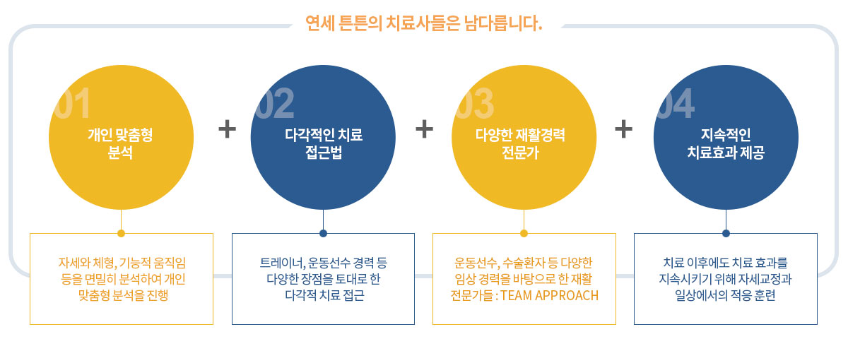 이러한 지속적인 반복 운동은 뇌에서 통증 억제 호르몬을 분비 시켜 고통을 줄여줍니다. 또한 인대를 치유하고 근육을 강화시켜 병의 재발을 막아줍니다.